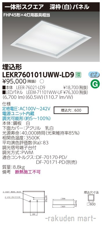 東芝ライテック LEKR760101UWW-LD9 ベースライト□600深枠白WW色