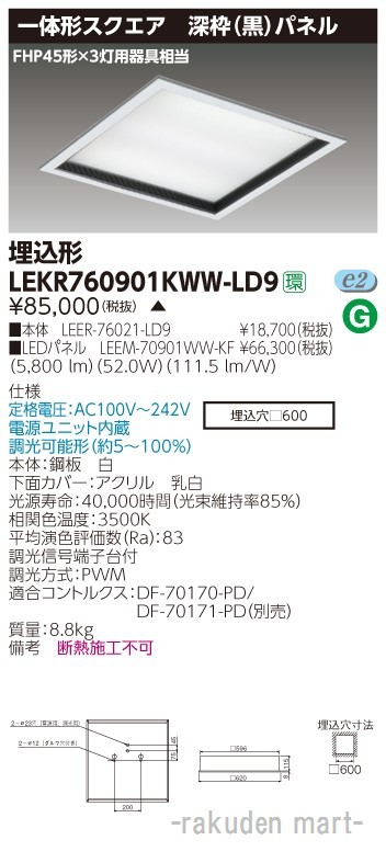 東芝ライテック LEKR760901KWW-LD9 ベースライト□600深枠黒WW色