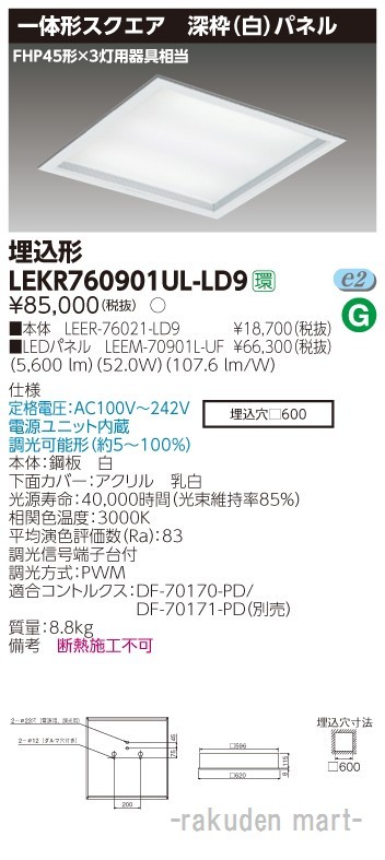 東芝ライテック LEKR760901UL-LD9 ベースライト□600深枠白L色
