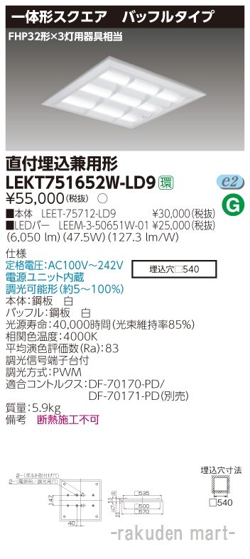 東芝ライテック LEKT751652W-LD9 TENQOOスクエア直埋□570BF