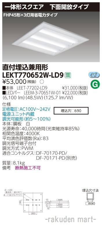 東芝ライテック LEKT770652W-LD9 TENQOOスクエア直埋□720開放