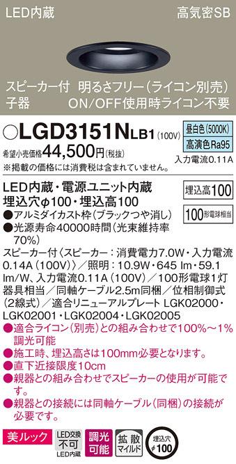 パナソニック LGD3151NLB1 スピーカー付DL子器黒100形拡散昼白色 Panasonic