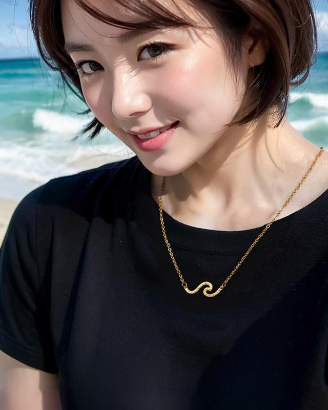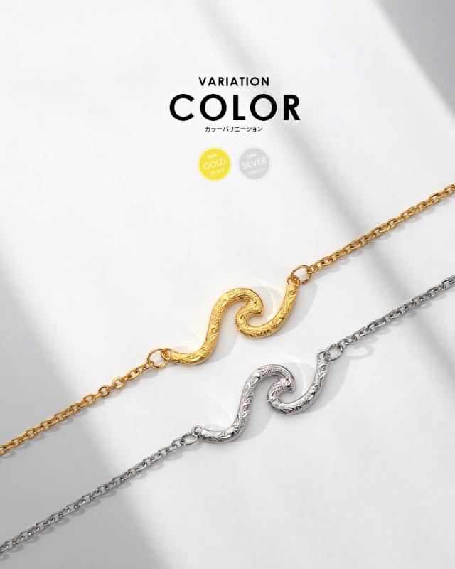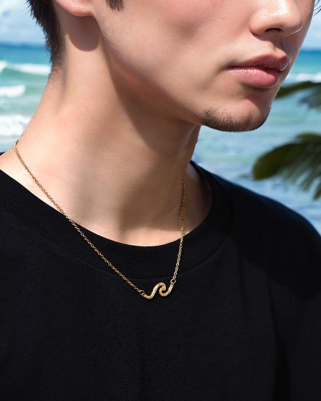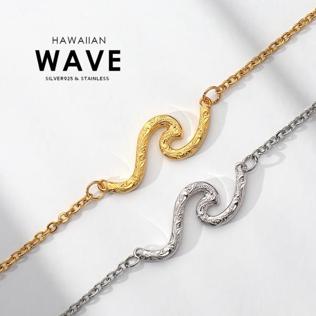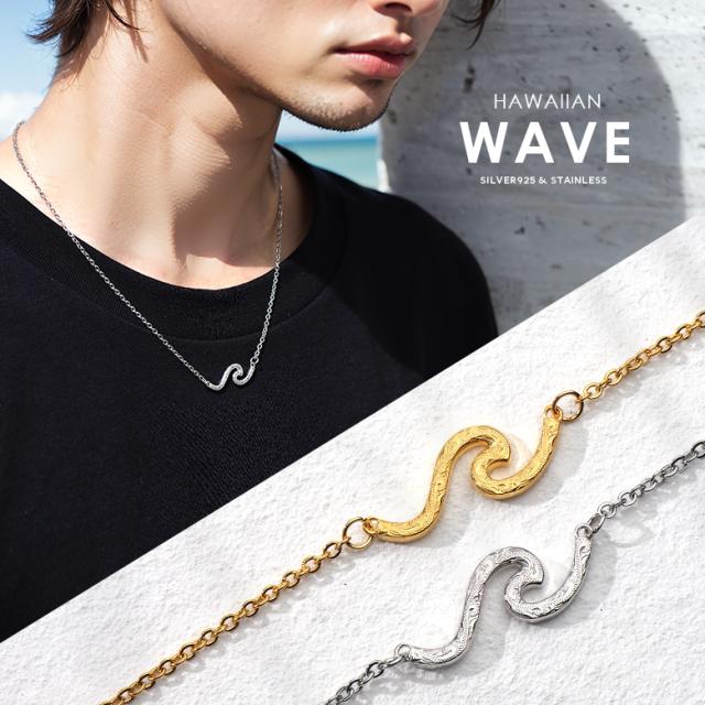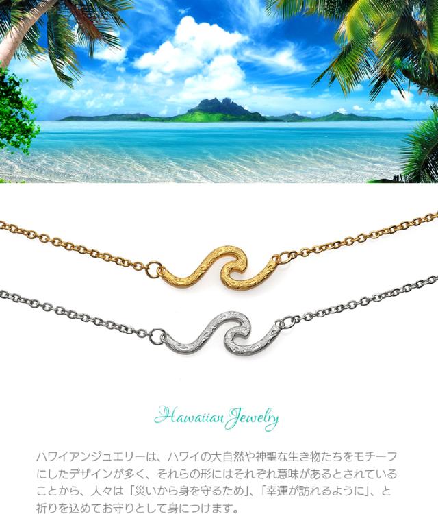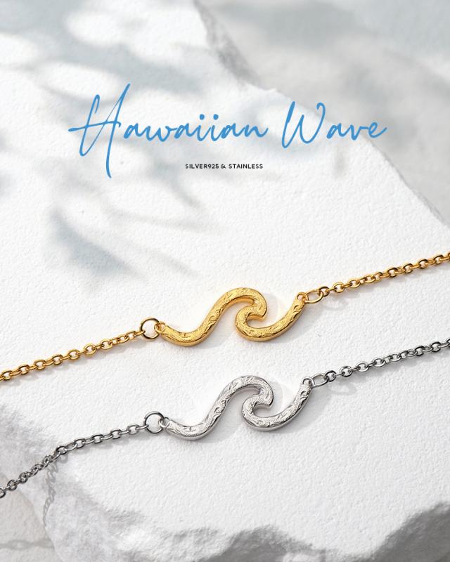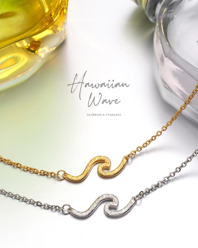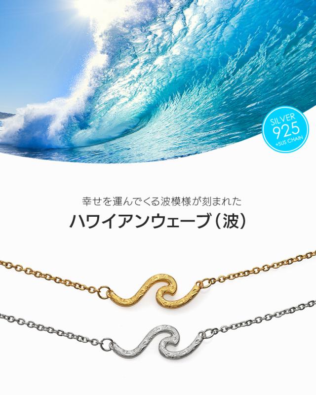 波の形をモチーフにしたネックレスです。波のシルエットの中に、ハワイアン模様のスクロール(波)を彫り込んだハワイアンジュエリーで、ハワイアンジュエリーの波模様には、途切れることのない愛や、幸せを運ぶという想いが込められています。変色しにくく、また上質な輝きを持つロジウムと18金でコーティングした2色をご用意しました。肌に触れるチェーン部分は、金属アレルギーが出にくいステンレス製のチェーンを使用しています。波部分の素材は、ハワイアンの彫りが美しく表現できるシルバー925で制作。約5cmのアジャスター付で、45cmから50cmの間で調整が可能です。