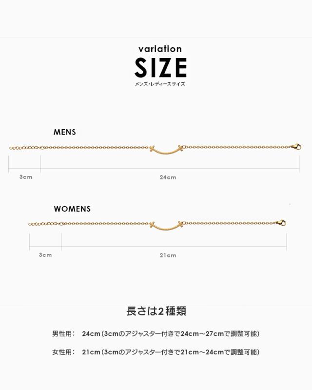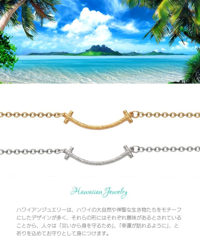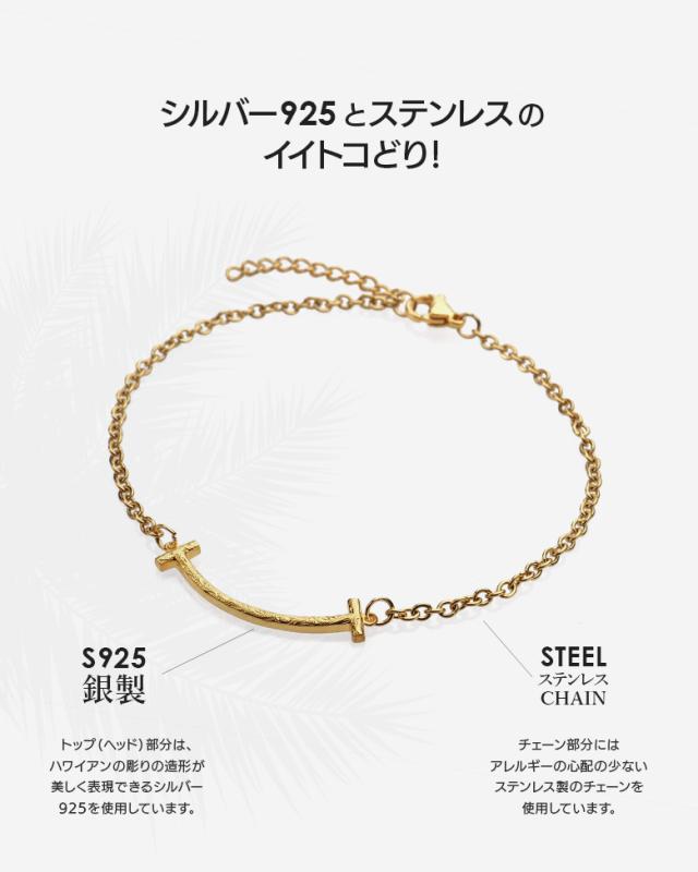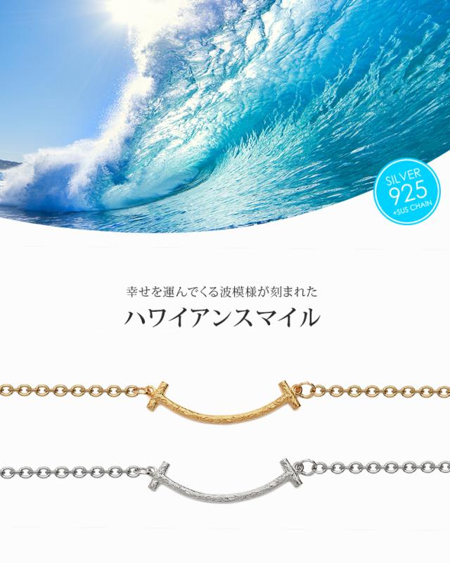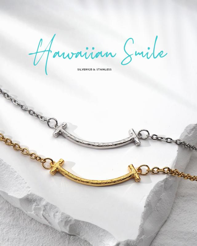 スマイルマークの口元をモチーフにしたアンクレットです。スマイルのシルエットの中にハワイアン模様のスクロール(波)を彫り込んだハワイアンジュエリーで、ハワイアンジュエリーの波模様には、途切れることのない愛や、幸せを運ぶという想いが込められています。変色しにくく、また上質な輝きを持つロジウムと18金でコーティングした2色をご用意しました。肌に触れるチェーン部分は、金属アレルギーが出にくいステンレス製のチェーンを使用しています。スマイル部分の素材は、ハワイアンの彫りが美しく表現できるシルバー925で制作。約3cmのアジャスター付で、21cmから24cm(レディースサイズ)、24cmから27cm(メンズサイズ)で調整可能です。