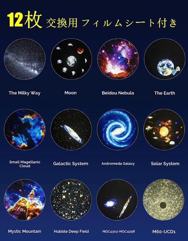 【魅惑的な投影バラエティ:12枚のフィルムディスクで宇宙、星空、天文のシーンを探索】宇宙、星空、天文のシーンをテーマにした投影ライトとともに12枚のフィルムディスクを含んでいます。