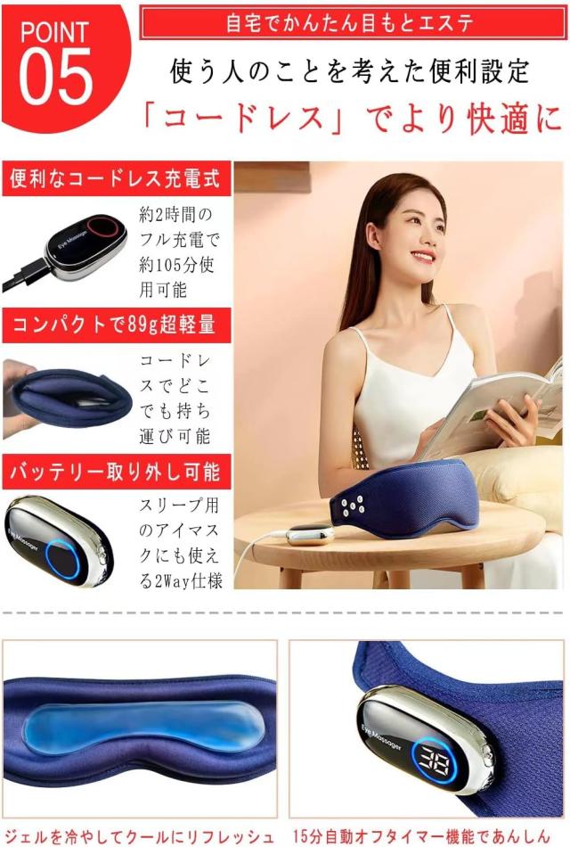 男女問わず気軽にご使用いただける便利なコードレスタイプのバッテリー取付式アイマスクです。