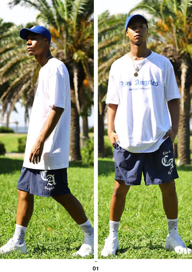 LA(エルエー)の 略称で馴染み深い「Los Angeles」をドロップしたTシャツとカリフォルニア州の略称の「CA」を冠したナイロンハーフパンツの上下セット。