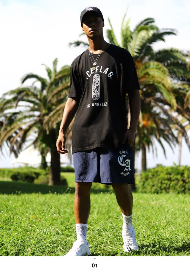 スケートボードをドロップしたTシャツとカリフォルニア州の略称の「CA」ロゴを冠したナイロンハーフパンツの上下セット。