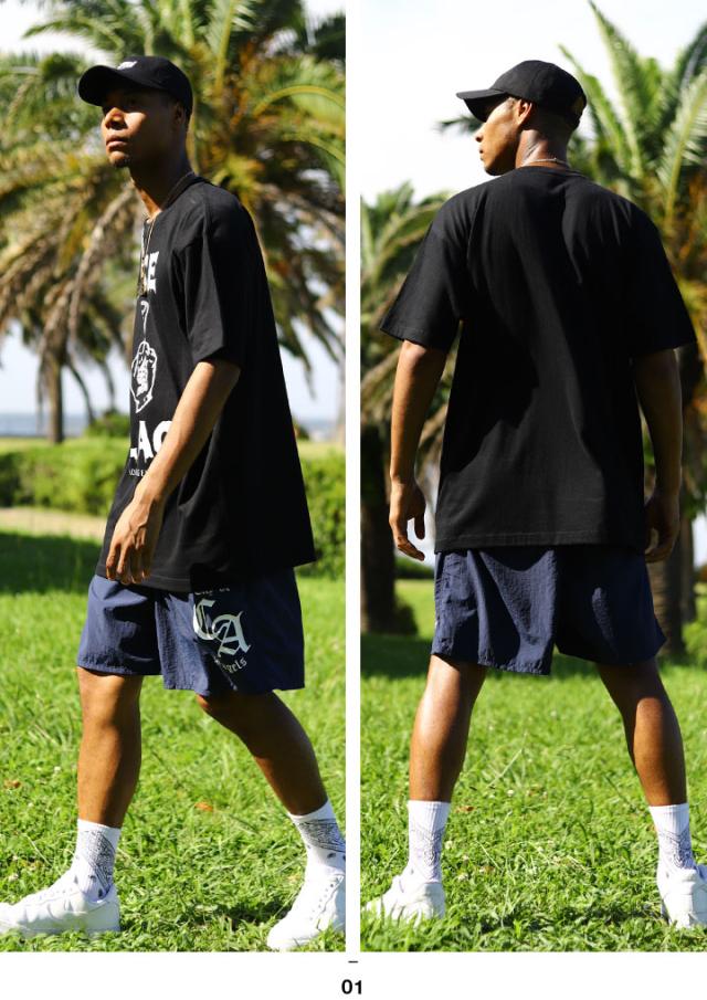 The finger(ファックサイン)を特大版で大胆にドロップしたTシャツとカリフォルニア州の略称の「CA」ロゴを冠したナイロンハーフパンツの上下セット。