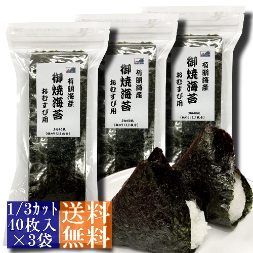 【送料無料】有明海産焼海苔(並)・おむすび用(1/3カット)40枚入×3袋セット【メール便・ポスト投函】