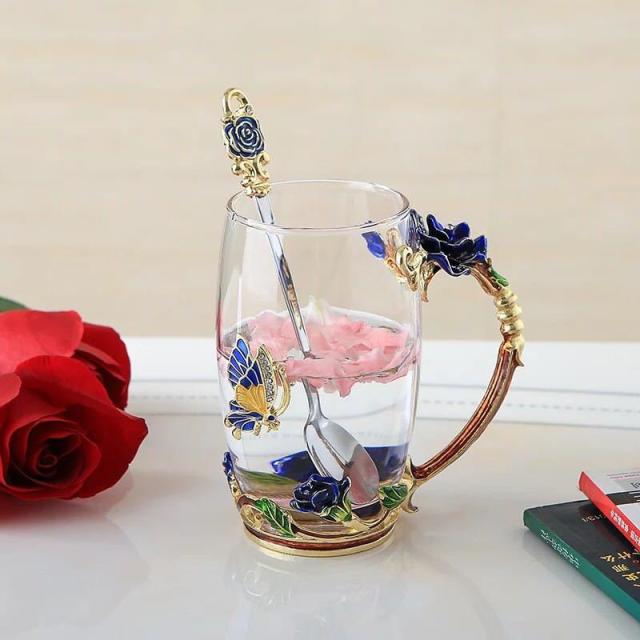 バラ花柄ガラス製 ティーカップ 2点セットコーヒーカップ