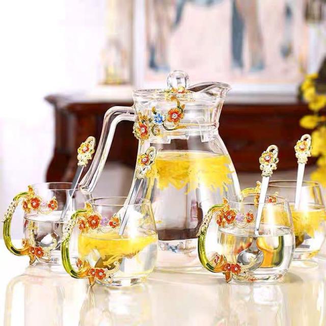 ティーポット コーヒーカップ 5点セット .ガラス製 花柄