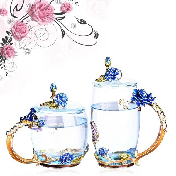 上品バラ ガラス製 ティーカップ 6点セット食器 コーヒーカップ〜蓋付き