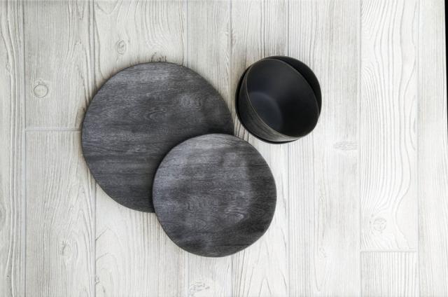 炭化した樹木を模したマットでシックな風合いのメラミン食器です