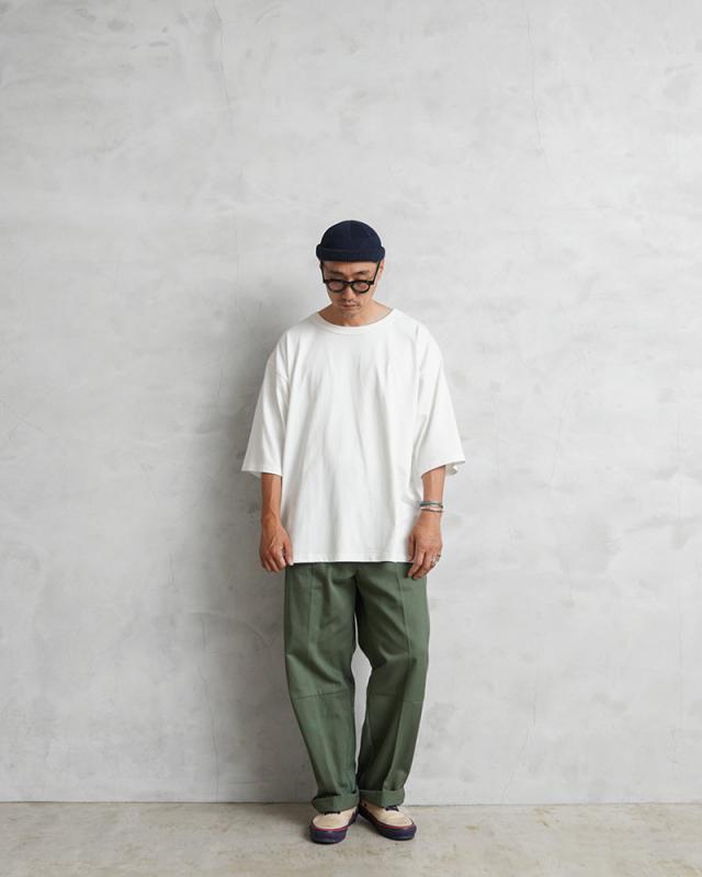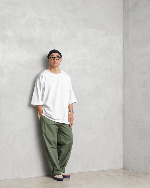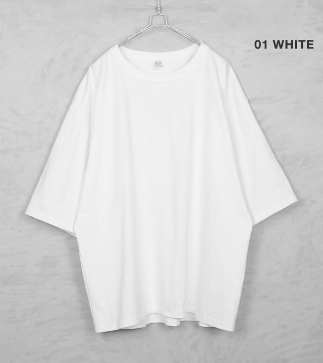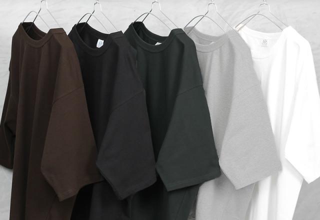 FRUIT OF THE LOOM(フルーツオブザルーム)より、ヘビーウエイト生地を用い、ゆったりオーバーなサイズ感で仕上げられた 5分袖 オーバーサイズ Tシャツが登場しました。生地を挟み込んだバインダー始末の襟ぐりは、やや広めの設定でヌケ感の作り。身幅はゆとりがあり、アームホールも広めで肩も落ちたオーバーサイズな作りがトレンド感のあるシルエットです。使用している生地はコットン100%の天竺生地。2本の糸を通して度目を詰めて編み立てた引き揃えという天竺生地だからこそ、密度も高く丈夫な作り。表面に現れる編み地もより美しく肌触りが良いのも特徴です。シンプルなデザインでコーディネートが組みやすく、極厚生地の素材感、オーバーシルエットの存在感で他とは違った一着になっています。