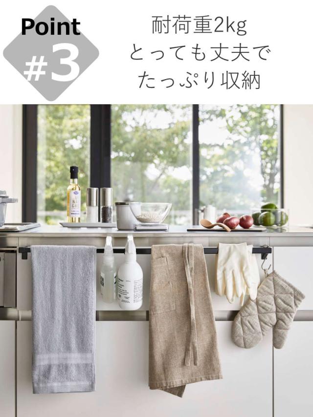 シンク下の扉にフックを掛けて取り付けできる、伸縮ロングタオルハンガーバーです。伸縮タイプで横幅を自分の好きな長さに調節できるから、ご家庭のキッチンにちょうどいい収納ができます。タオルや鍋つかみ、ゴム手袋などよく使うものを手元に収納できるので、家事が捗ります。