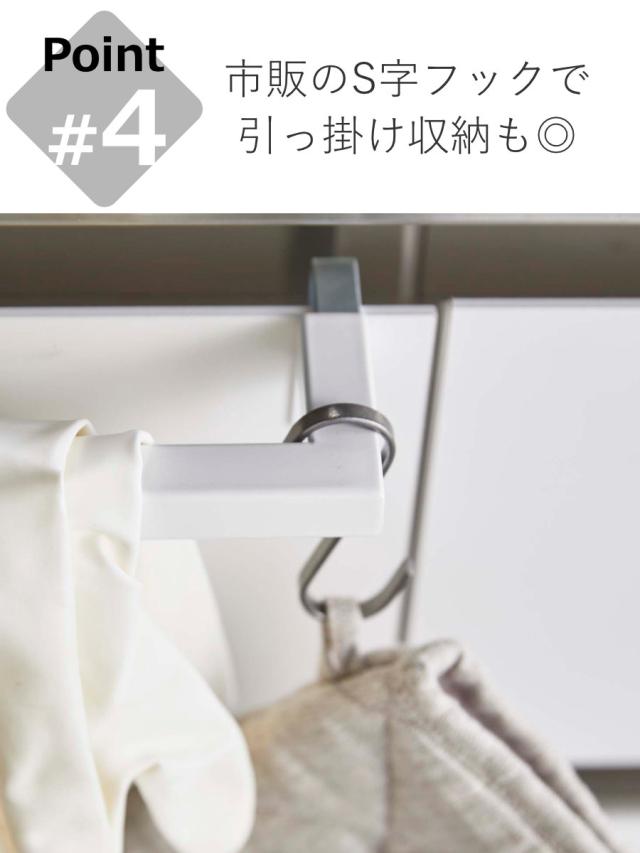 市販のS字フックをお使いいただく事で、ループの付いたミトンや調理小物も掛けやすくなります。