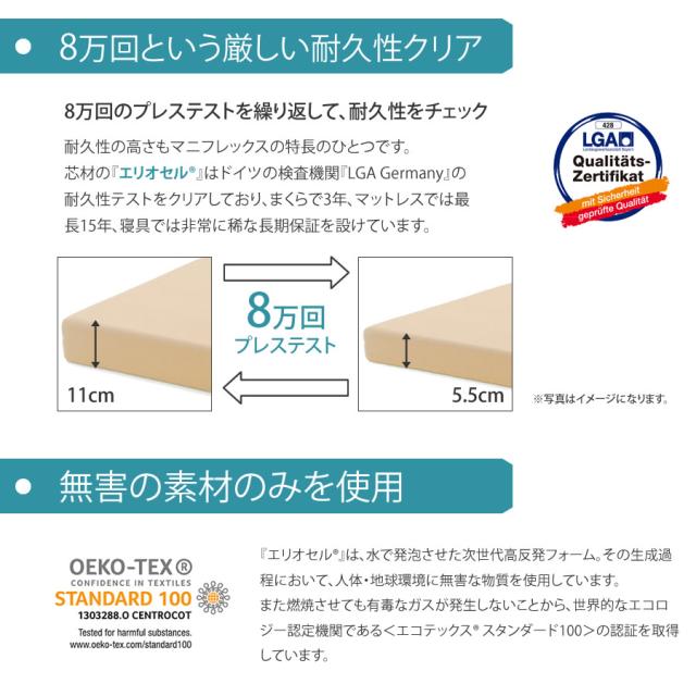イタリア生まれの熟睡寝具、マニフレックスは、創業60年以上の歴史をもつ寝具ブランドで、世界99ヵ国以上に輸出され世界中の人たちに愛されています。 マニフレックスは、スプリングゼロ・プラスチックゼロ・有毒ガスゼロ・3つのゼロで人と地球にやさしい寝具です。 長年の研究の末に開発された「エリオセル」の構造が、スプリングやプラスチックを使用しなくても高反発性を備えることを可能にしました。 横たわると、背中・腰・お尻にかけての自然なカーブに沿って体全体を受け止め、適度な反発力でしっかりと支え上げます。 「エリオセル」は水を基に発泡させる次世代高反発フォームであり、生成過程においても人体や地球環境に有害な物質を使用せず、また、燃焼させても有毒なガスが発生しません。 「エリオセル」は温度変化に強く1年を通して変わらない寝心地でお休みいただけます。オープンセル分子構造で、まるで呼吸をするかのように通気性がよく、耐久性にも優れており、ドイツの検査機関「LGA GERMANY」の厳しい耐久性テストをクリアしています。 高反発と優れた耐久性・通気性を持った「エリオセル」だから、 真空ロールパッケージ が可能に。体積を1/8にまで圧縮することで、輸送コストだけでなく 温室効果ガスの大幅な削減 にも貢献しています。 |