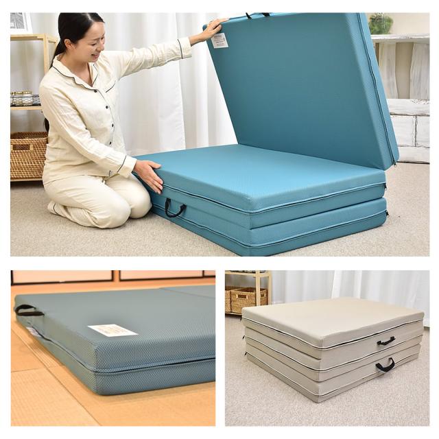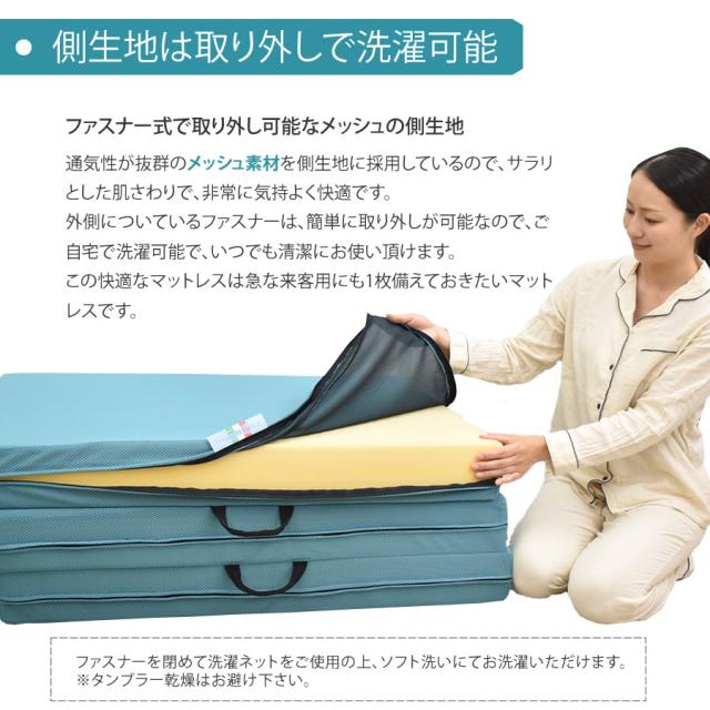 便利な三つ折りタイプ 日本限定 収納に便利な折りたたみタイプ 場所を取らずに持ち運びもできるのでお部屋を広く使えます。 畳の和室でもフローリングのお部屋でも直敷きが可能、 来客用にも大変便利。 理想の体圧分散 芯材は高密度構造素材「エリオセル」 硬すぎず柔らかすぎない、最適な弾力特性を復元性を発揮します。 体圧を均等に分散し最適な睡眠姿勢をサポート!またエリオセルは 保湿性と放湿性に優れたオープンセル構造なので蒸れにくく非常に快適な素材です。 環境に配慮したスプリングレス構造 コンパクトで衛生的な真空パック
