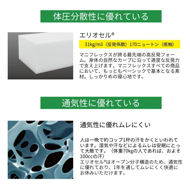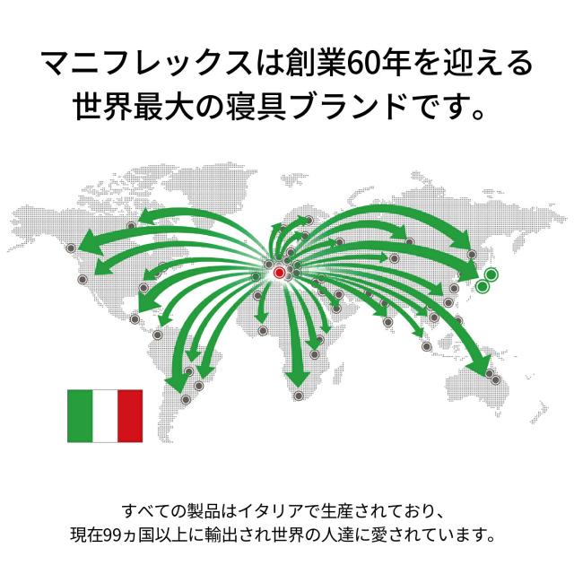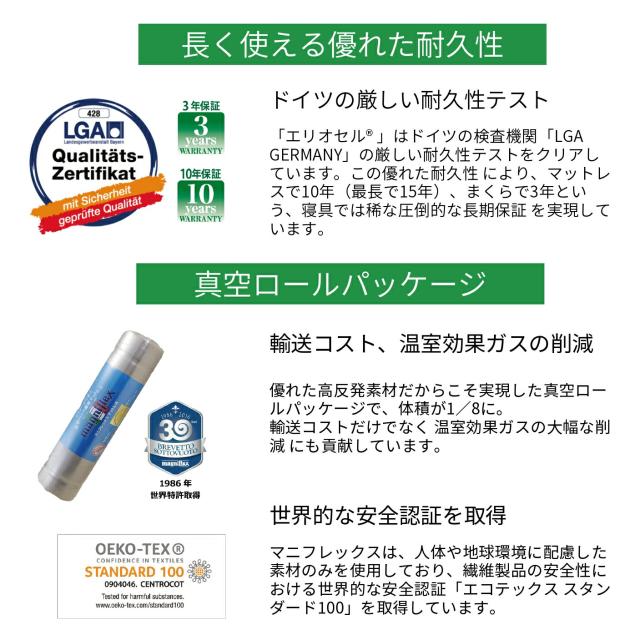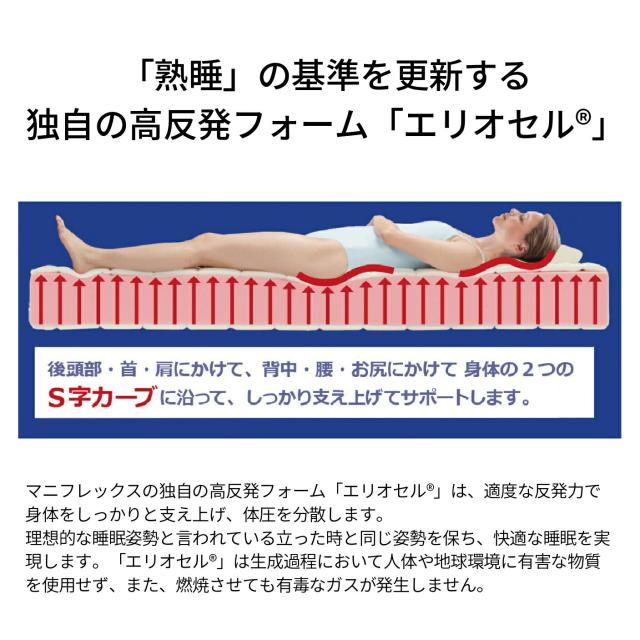 イタリア生まれの熟睡寝具、マニフレックスは、創業60年以上の歴史をもつ寝具ブランドで、世界99ヵ国以上に輸出され世界中の人たちに愛されています。 マニフレックスは、スプリングゼロ・プラスチックゼロ・有毒ガスゼロ・3つのゼロで人と地球にやさしい寝具です。 長年の研究の末に開発された「エリオセル」の構造が、スプリングやプラスチックを使用しなくても高反発性を備えることを可能にしました。 横たわると、背中・腰・お尻にかけての自然なカーブに沿って体全体を受け止め、適度な反発力でしっかりと支え上げます。 「エリオセル」は水を基に発泡させる次世代高反発フォームであり、生成過程においても人体や地球環境に有害な物質を使用せず、また、燃焼させても有毒なガスが発生しません。 「エリオセル」は温度変化に強く1年を通して変わらない寝心地でお休みいただけます。オープンセル分子構造で、まるで呼吸をするかのように通気性がよく、耐久性にも優れており、ドイツの検査機関「LGA GERMANY」の厳しい耐久性テストをクリアしています。 高反発と優れた耐久性・通気性を持った「エリオセル」だから、 真空ロールパッケージ が可能に。体積を1/8にまで圧縮することで、輸送コストだけでなく 温室効果ガスの大幅な削減 にも貢献しています。 |