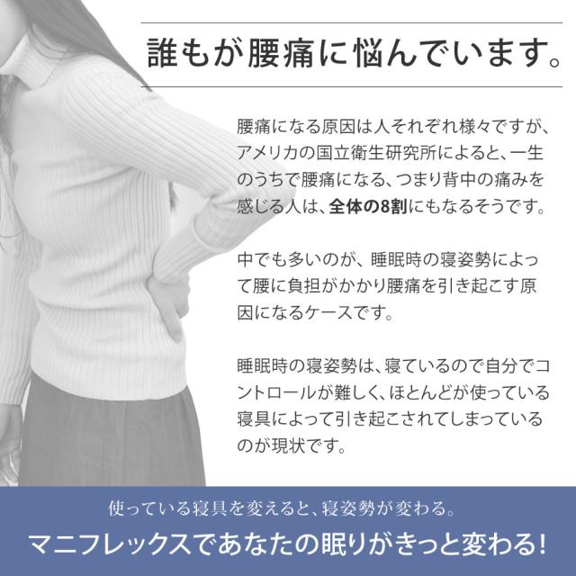 イタリア生まれの熟睡寝具、マニフレックスは、創業60年以上の歴史をもつ寝具ブランドで、世界99ヵ国以上に輸出され世界中の人たちに愛されています。 マニフレックスは、スプリングゼロ・プラスチックゼロ・有毒ガスゼロ・3つのゼロで人と地球にやさしい寝具です。 長年の研究の末に開発された「エリオセル」の構造が、スプリングやプラスチックを使用しなくても高反発性を備えることを可能にしました。 横たわると、背中・腰・お尻にかけての自然なカーブに沿って体全体を受け止め、適度な反発力でしっかりと支え上げます。 「エリオセル」は水を基に発泡させる次世代高反発フォームであり、生成過程においても人体や地球環境に有害な物質を使用せず、また、燃焼させても有毒なガスが発生しません。 「エリオセル」は温度変化に強く1年を通して変わらない寝心地でお休みいただけます。オープンセル分子構造で、まるで呼吸をするかのように通気性がよく、耐久性にも優れており、ドイツの検査機関「LGA GERMANY」の厳しい耐久性テストをクリアしています。 高反発と優れた耐久性・通気性を持った「エリオセル」だから、 真空ロールパッケージ が可能に。体積を1/8にまで圧縮することで、輸送コストだけでなく 温室効果ガスの大幅な削減 にも貢献しています。 |