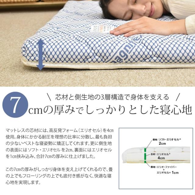 芯材:エリオセル?(保護カバー付) ポリエステル 100% ダイヤモンドキルト加工 上面/ソフト・エリオセル?2cm 下面/エリオファイバー+エリオセル? |