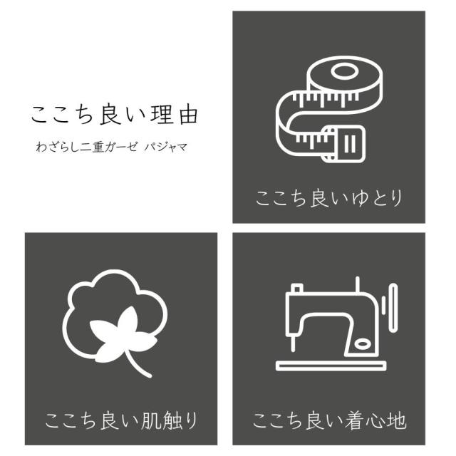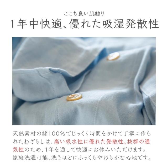 ここちよいゆとり、ここちよい肌触り、ここちよい着心地 パジャマに必要な3つの要素はやっぱり「ここちよい」でした。 これからは就寝前に、ルームウェアから「ここちよい」に着替えてしっかりと熟睡しませんか? 伝統的製法で丁寧に生成された和晒は、一本一本の綿繊維が傷つくことがないため、ふんわりやわらかな心地です。 天然素材の綿100%のため通気性がよく吸湿発散性にもすぐれており、ご家庭でお洗濯が可能です。 寝返りしやすいゆとりある設計や、便利なポケットや袖口・裾口のゴム穴付きで細部までここちよさにこだわっています。 |
