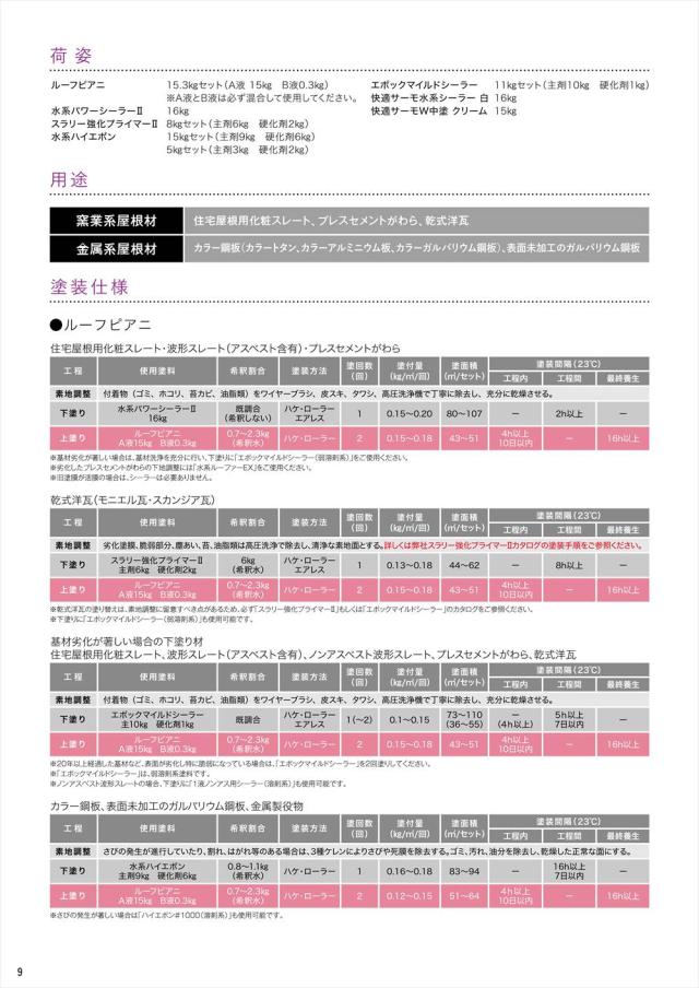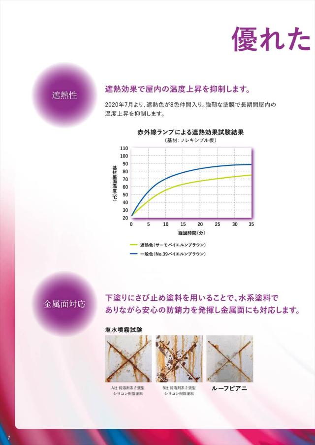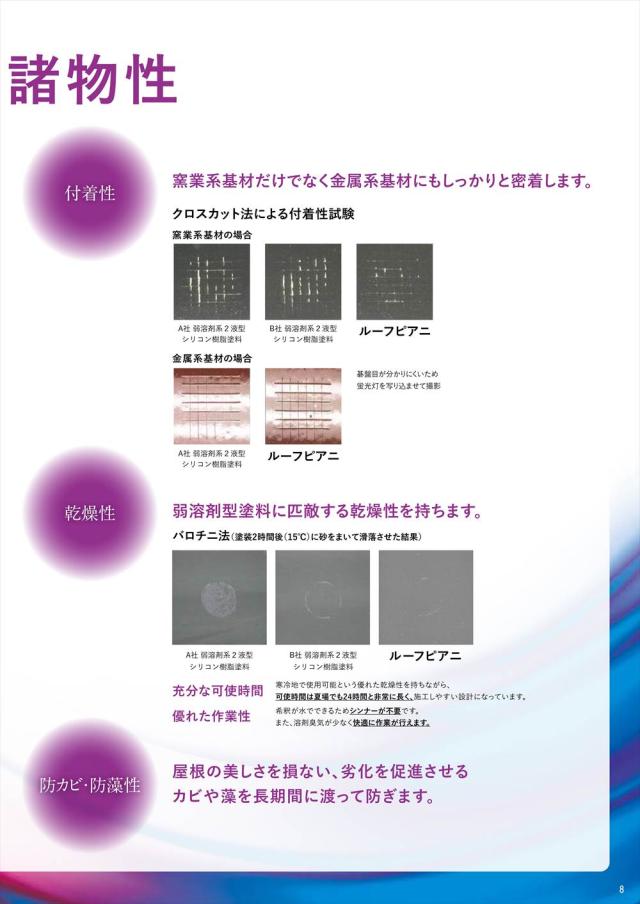 ルーフピアニは、弱溶剤系2液型シリコン樹脂塗料に匹敵する耐候性を保持した水系塗料です。