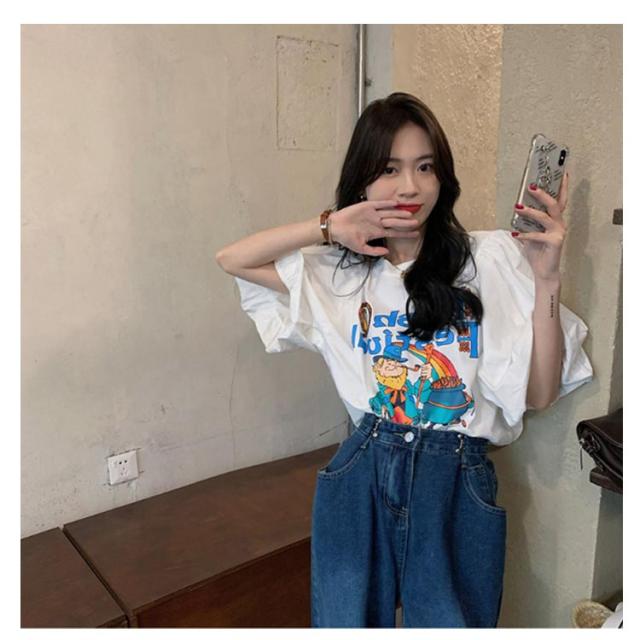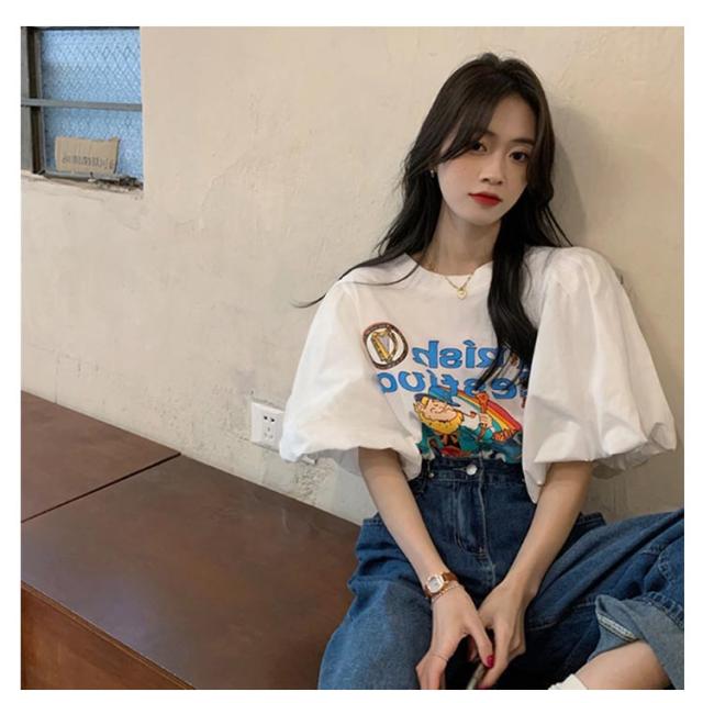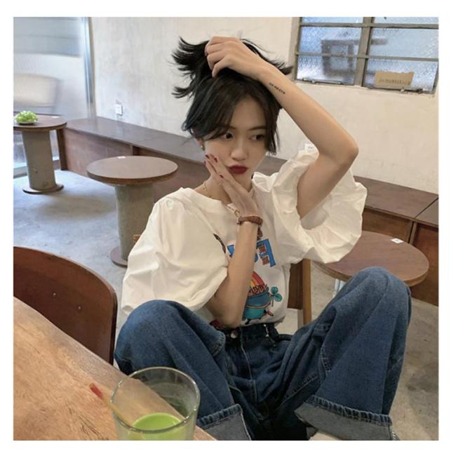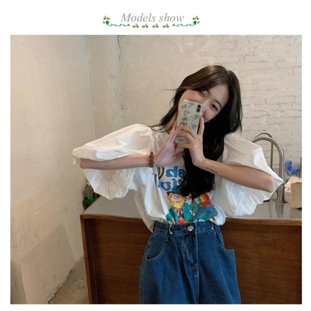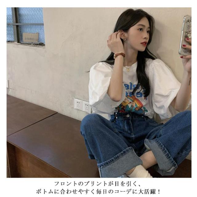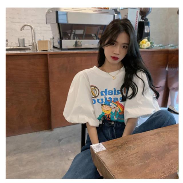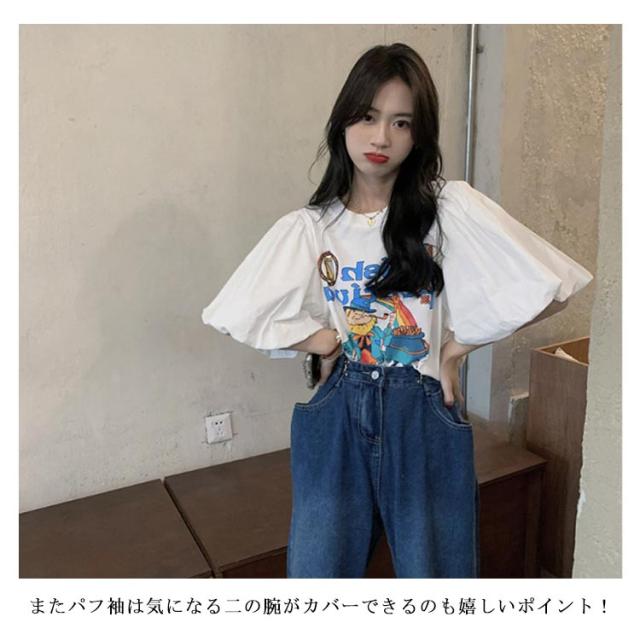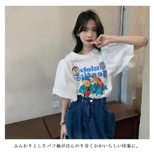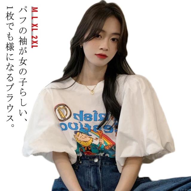 夏服 レディース Tシャツ ふんわり クルーネック 五分袖 プリント プルオーバー バルーン袖 ボリューム袖 半袖 トップス カットソー 体型カバー かわいい カジュアル ゆったり バルーンスリーブトップス ブラウス 夏新作 春服 パフ袖