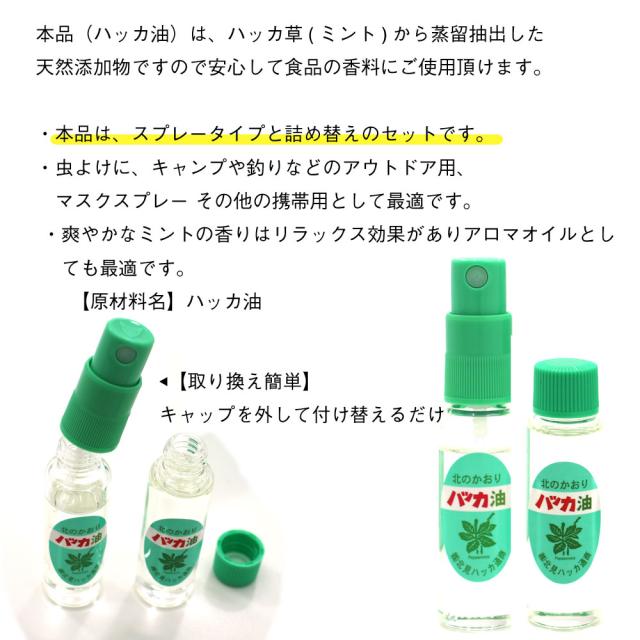 ・使用方法:便利なハッカ油のスプレータイプなので必要分使えます。 虫よけに、キャンプや釣りなどのアウトドア用、その他の携帯用として最適です。 爽やかなミントの香りはリラックス効果がありアロマオイルとしても最適です。 商品説明書付き