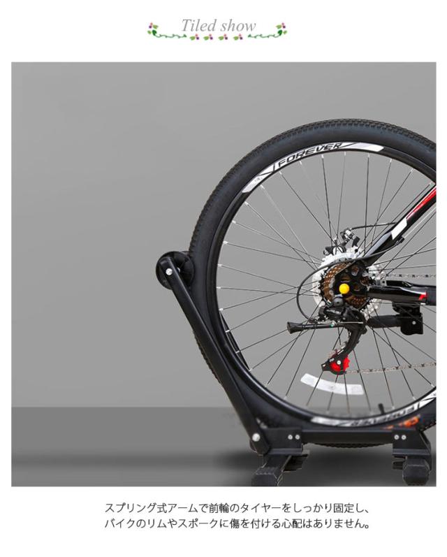 | 自転車を差し込むだけなので、簡単操作で素早く自転車を保管できます。 スプリング式アームで前輪のタイヤーをしっかり固定し、バイクのリムやスポークに傷を付ける心配はありません。 安定していて、倒れるない。抜群の安定感。ディスプレイスタンドとしても最適。 取り付工具必要無しで、お届けした箱から出してすぐにご使用いただけます。 ロードバイク、クロスバイクなどの様々な自転車に対応。 使わないときは折りたたみ式ですので、コンパクトに収納、スマートな設計で置き場も困らない! | |