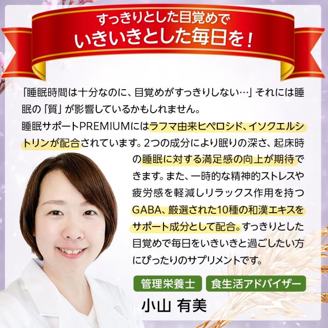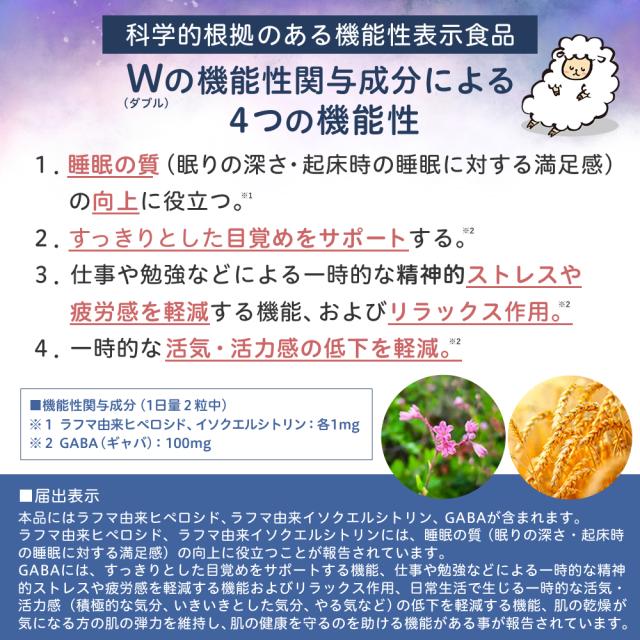 【届出表示】本品にはラフマ由来ヒペロシド、ラフマ由来イソクエルシトリン、GABAが含まれます。 ラフマ由来ヒペロシド、ラフマ由来イソクエルシトリンには、睡眠の質(眠りの深さ・起床時の睡眠に対する満足感)の向上に役立つことが報告されています。GABAには、すっきりとした目覚めをサポートする機能、仕事や勉強などによる一時的な精神的ストレスや疲労感を軽減する機能およびリラックス作用、日常生活で生じる一時的な活気・活力感(積極的な気分、いきいきとした気分、やる気など)の低下を軽減する機能、肌の乾燥が気になる方の肌の弾力を維持し、肌の健康を守るのを助ける機能があることが報告されています。