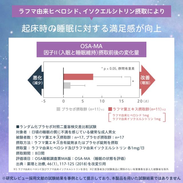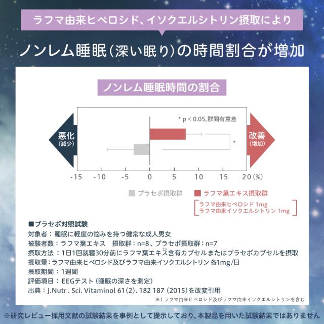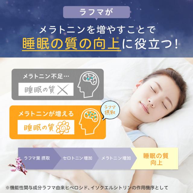 【ラフマとは】ヒペロシド、イソクエルシトリンを含み、メラトニンを増やし睡眠の質を向上させる。(機能性表示食品作用機序より)