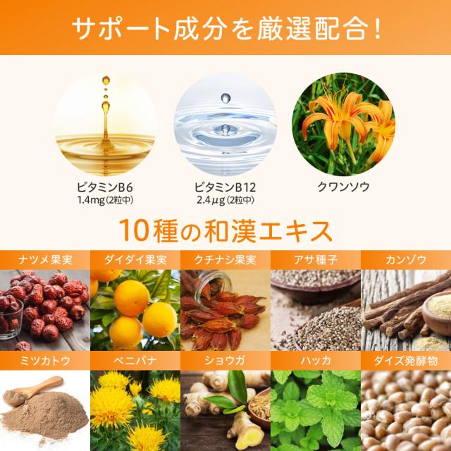 「クワンソウ」「ビタミンB6」「ビタミンB12」「10種の和漢エキス(ナツメ、ダイダイ、クチナ、アサ種子、カンゾウ、ミツカトウ、ベニバナ、ショウガ、ハッカ、大豆発酵物)」
