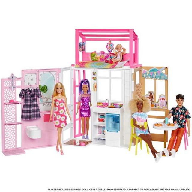 360度遊べるこのセットは、モダンなデザインで、バービーと彼女の愛らしいペットの子犬を含め、お子さまがごっこ遊びを楽しむのに必要なものが十分にそろっています。遊び終わったら、セット全体を折りたたんで簡単に片付けられ、外出先にも持ち運びが可能。プラスチック製のドールハウスなので耐久性があり長くお子さまに楽しんでいただけます。 玄関で友だちを迎え、キッチンで楽しく料理をして、2人掛けのダイニングテーブルで食事をしたり、ドールをロフトベッドに寝かせて、心地よい眠りを楽しませることもできます。