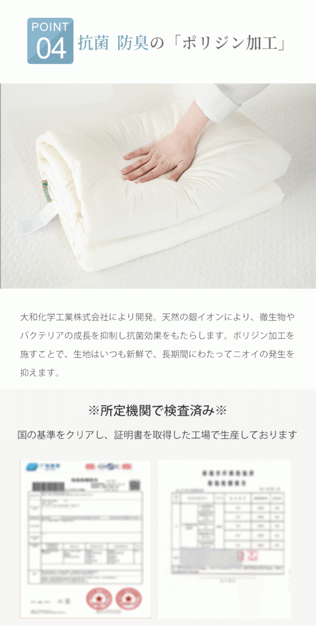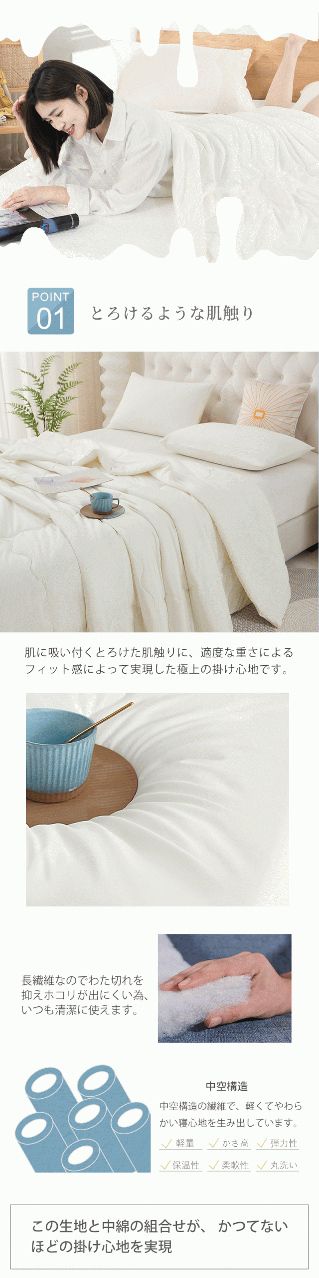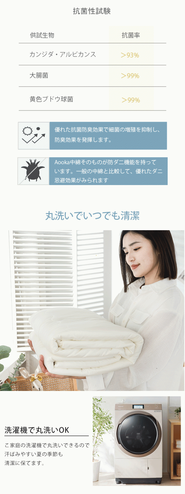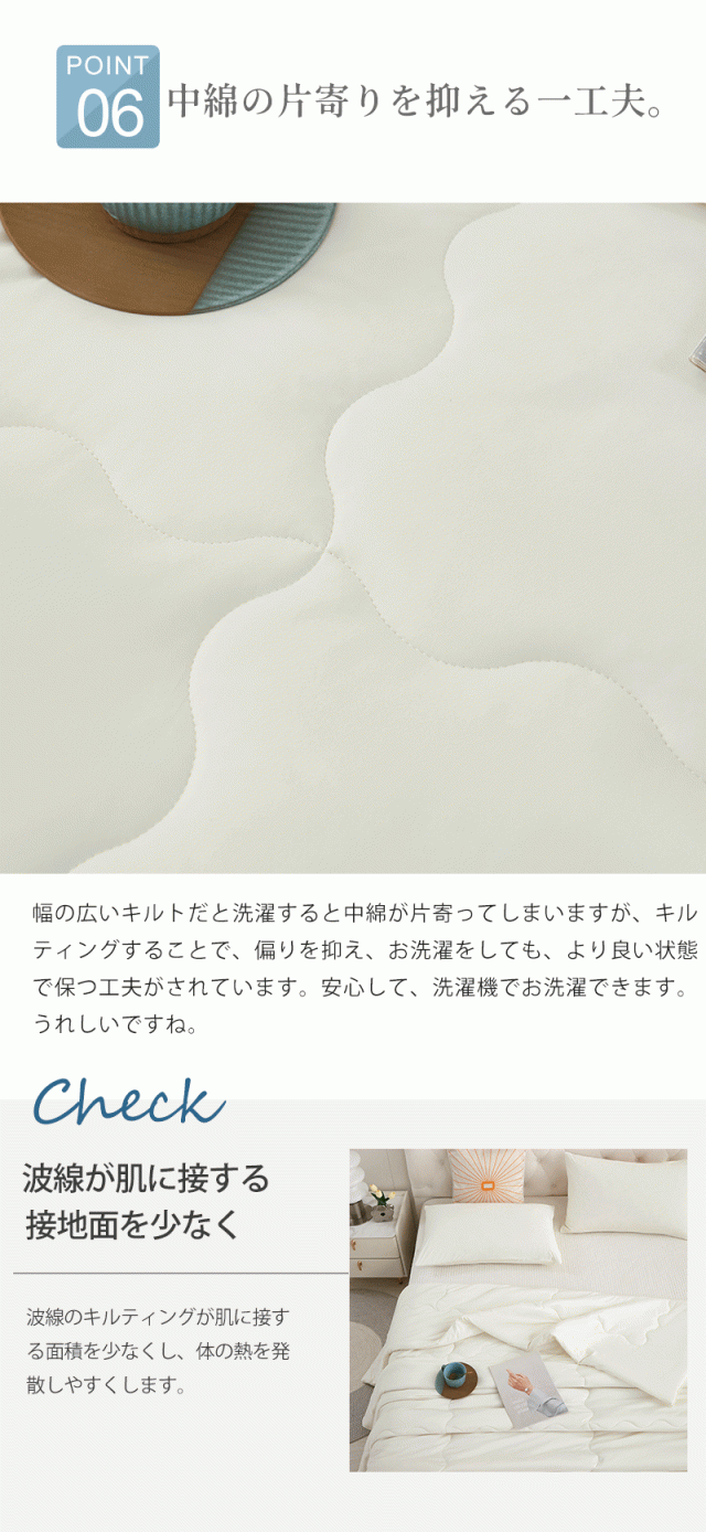 液温は40℃を限度として、洗濯機で弱い洗濯できる(ネット使用) お洗濯後、十分に干してからお使い下さい。 ※洗濯ネットをご使用ください。 ※色落ちする可能性がありますので、洗濯の際は単独洗いでお願いします。 ※洗濯後はつけおきしないで、形を整え直ちに干してください。 ※目立つ汚れがある場合は、「前処理」を 【立体キルト加工】布団のなかに仕切りを設けて、お洗濯時に詰め物が偏らないです。 |