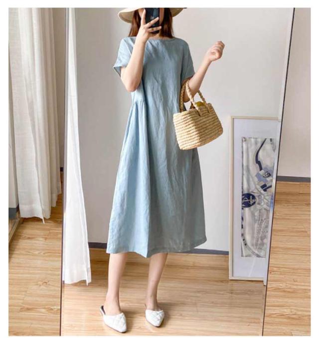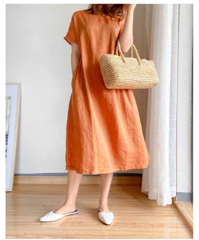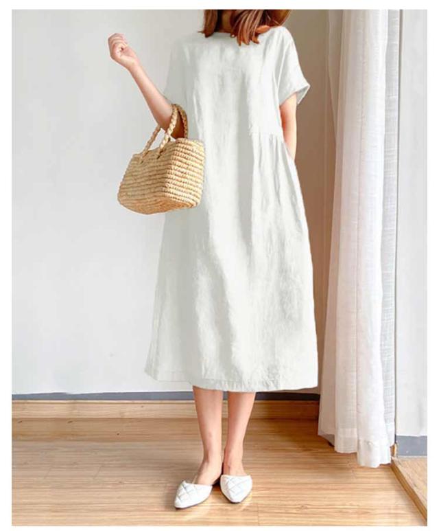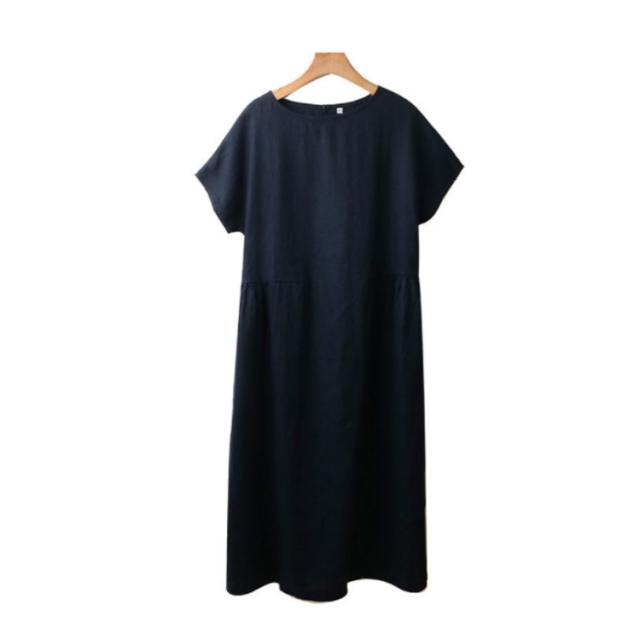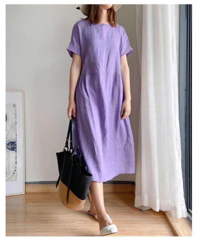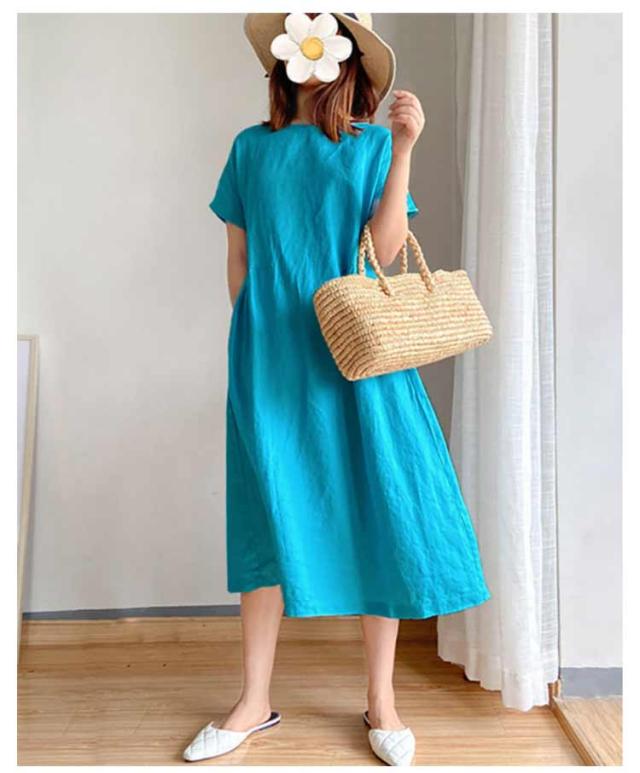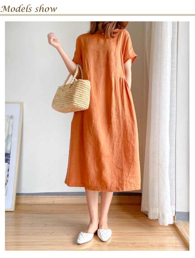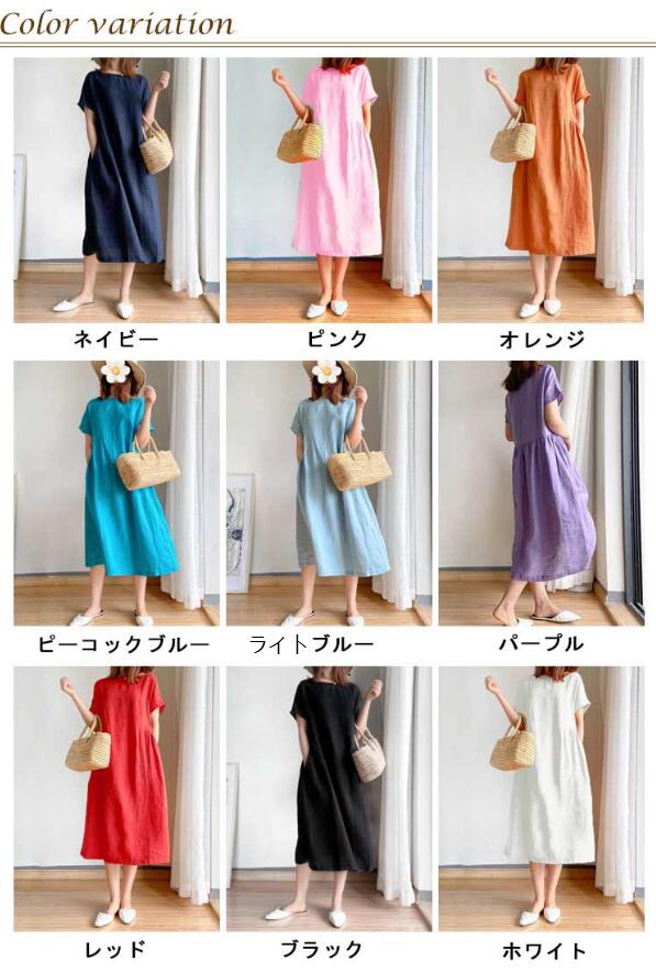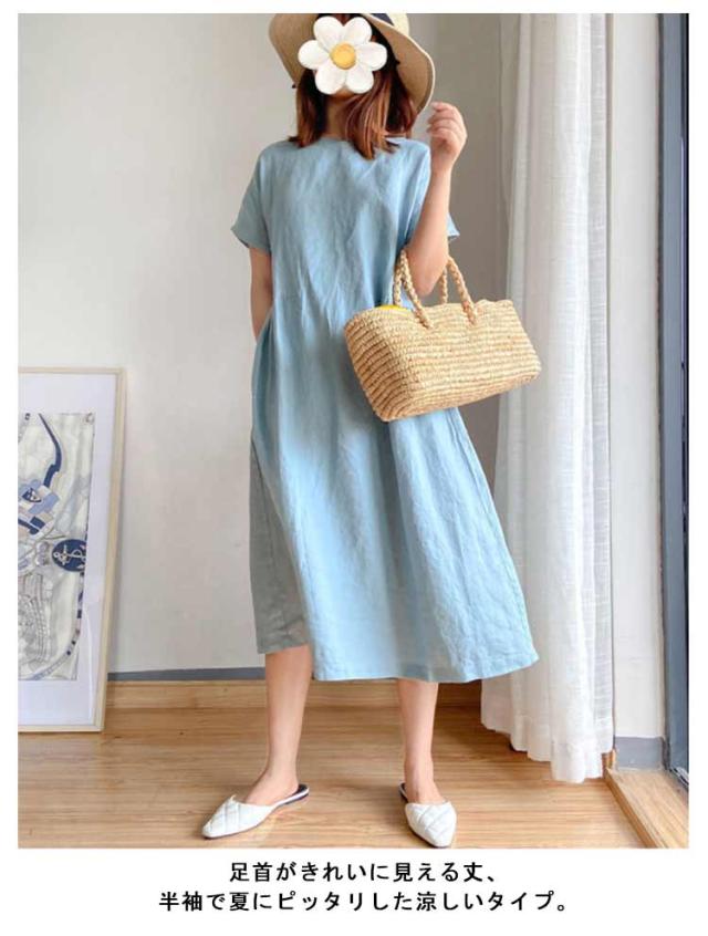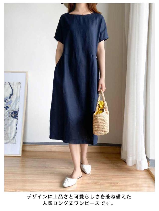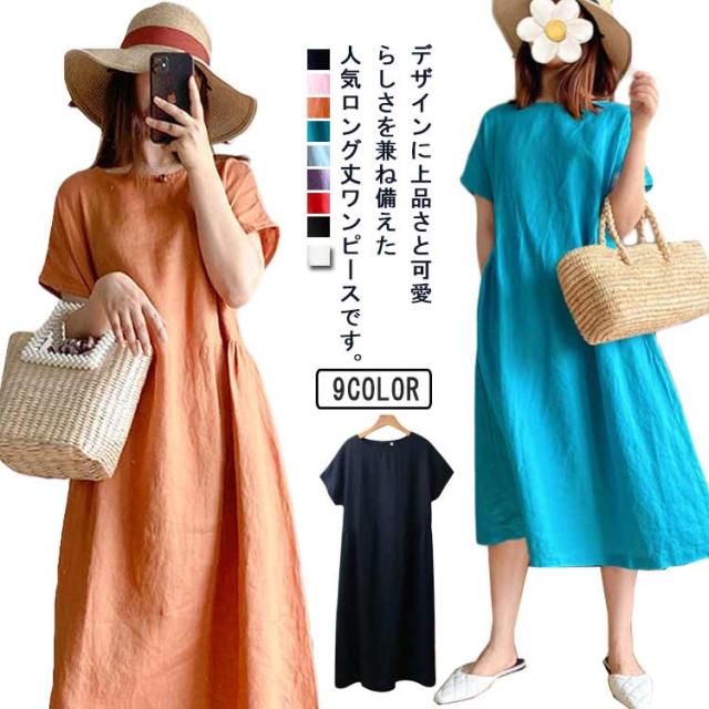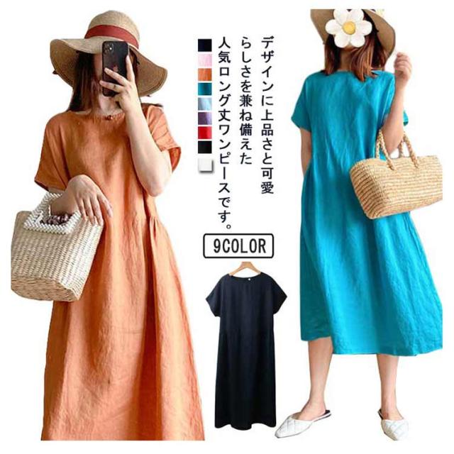 リネンワンピース ナチュラル ワンピース ロング丈ワンピース 半袖 夏ワンピース マキシワンピース 綿麻 麻 リネン ワンピ Aライン 春夏 薄手 無地 シンプル ポケット付き 大きいサイズ 送料無料