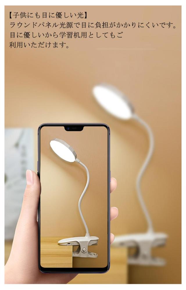 | 【クリップ式LEDライト】クリップ式のため、ベットや机、本棚など場所を選ばず使えます。 【使用用途】パソコンライト 学習用 在宅ワーク用 撮影用 倉庫用 在宅会議用 寝室用 ネイルライト用 二段ベッド用 【充電式デスクライト】USB充電式なのでどこでも持ち運べて便利。屋外の倉庫やアウトドアでも大活躍です。 【3段階調整】タッチパネルを軽く触れると、3段階で明るさを調整できます。 ベッドライトや勉強用、読書灯としてお好みの明るさを選べます。 【3色の光色】タッチパネル長押しで、3色の光色が選べます。明るさ調整と合わせ9つのモードで様々な場面に合わせて調整いただけます 【子供にも目に優しい光】ラウンドパネル光源で目に負担がかかりにくいです。目に優しいから学習机用としてもご利用いただけます。 【360°角度調整可能】自由に曲がれるアームにより高さや角度の調整が可能。 【多種類USB充電方式】台座の後ろにUSBポートを搭載。PC、、充電プラグ等から使用できます。 【使用箇所】シンプルなデザインは洋室 和室を選びません。リビングや勉強部屋以外にも洗面所やドレッサーにも。コードレスだから、屋外の倉庫照明やアウトドア キャンプにもご使用いただけます。 | |