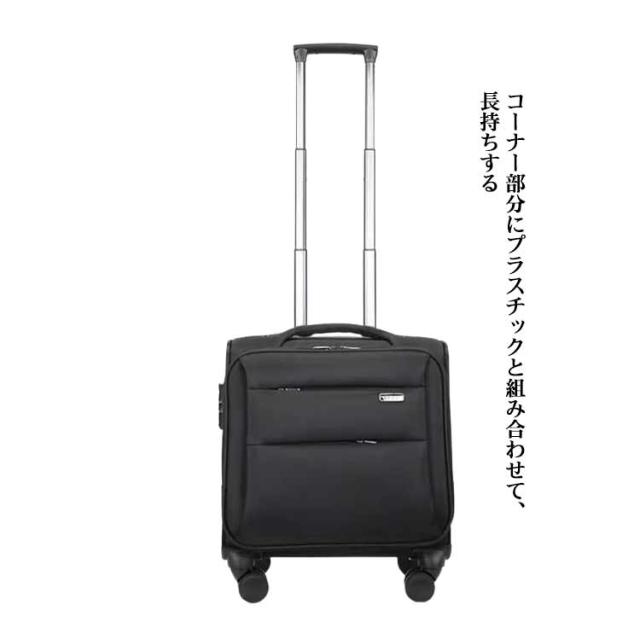 | 機内持ち込みOK!軽量 TSAロック 1〜3泊程度の出張や旅行に適したスーツケース。 3段階のプッシュ式ハンドルバーは錆びにくいアルミ製! 360度回転自由自在のダブルキャスターを4輪装備! 小物の整理に便利な多彩なポケット! TSAダイヤルロックシステム標準装備! シンプルなデザインで軽く、キャスターの動きがスムーズで使いやすいです。前面にPC収納もあり、小物も収納できるので使い勝手が良いです。コーナー部分にプラスチックと組み合わせて、長持ちする 撥水テフロン加工ナイロン使用の為、通気性も損なわず、お手入れの手間もかかりません。 | |