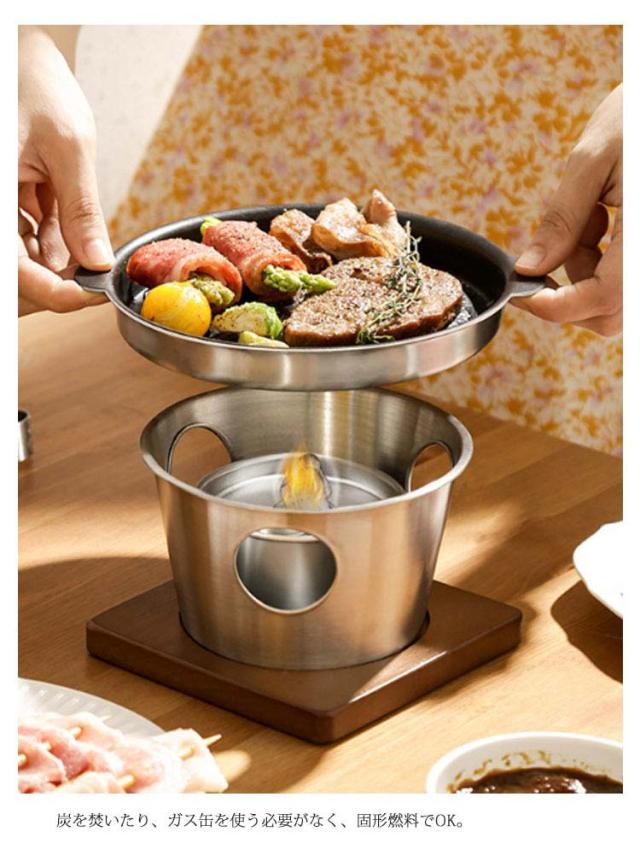 バーベキュー 鉄板プレート 送料無料 IH〜ガス火対応 一人焼肉 焼き肉プレート 焼肉プレ ト ひとり用 1−2人用 鉄板焼き プレート 一人用コンロ 専用木台付き ミニコンロ付き 固形燃料 コンロ 16CM 鉄板焼きコンロ ひとり暮らし