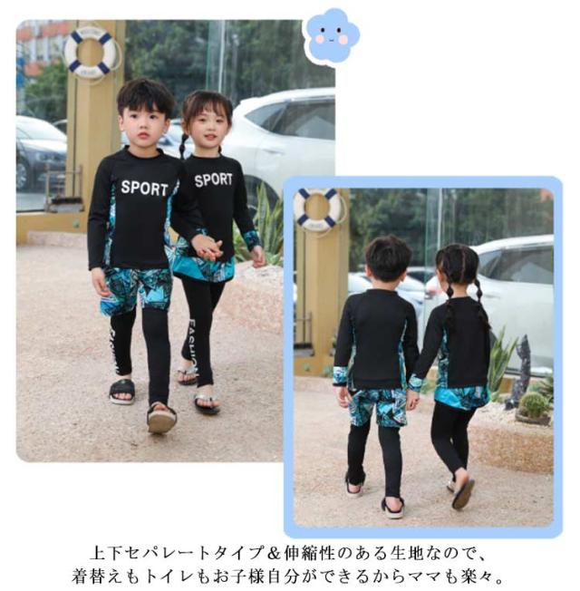 | ラッシュガード+ハーフパンツ+レギンスの子供3点セット水着。 長袖&長ズボンのデザインがお肌の露出を抑えて、紫外線や日焼け対策、クラゲ対策にバッチリ子供用水着のセット。 上下セパレートタイプ&伸縮性のある生地なので、着替えもトイレもお子様自分ができるからママも楽々。 スタンドカラーで、首元の露出も控えめで、窮屈にならず、快適に着用できます。 プールや海だけでなく、水辺での遊びやレジャーなど様々なシーンで活躍間違い無し。 | |