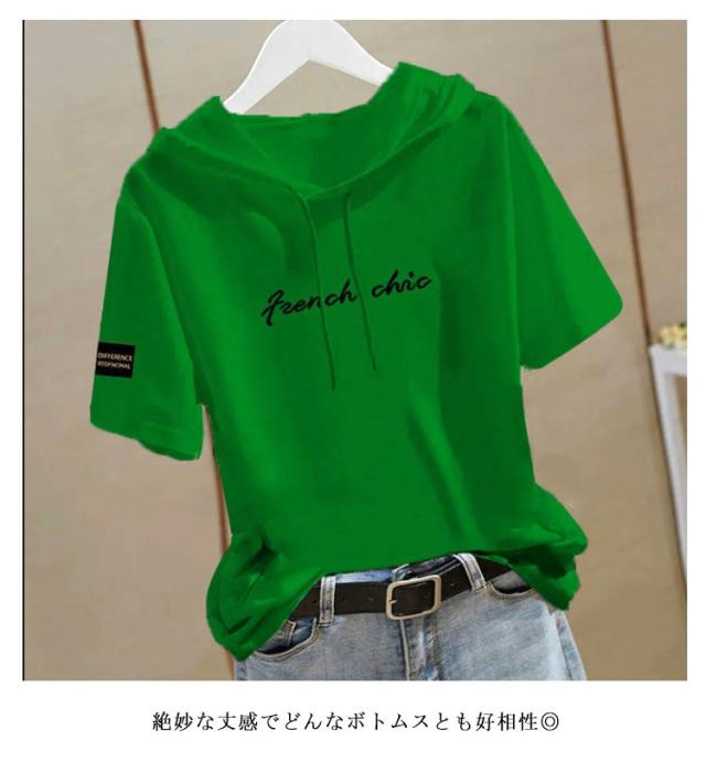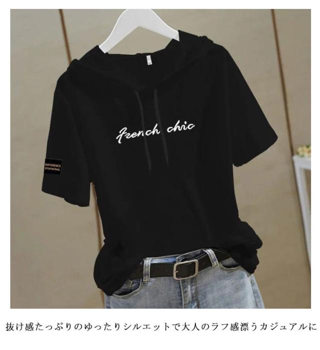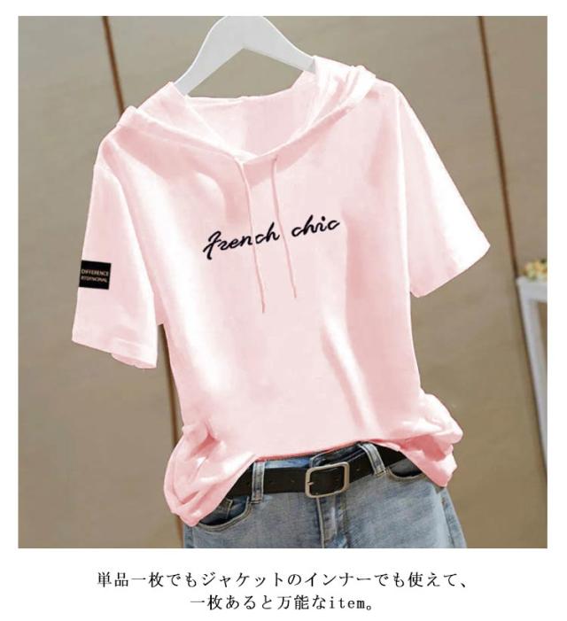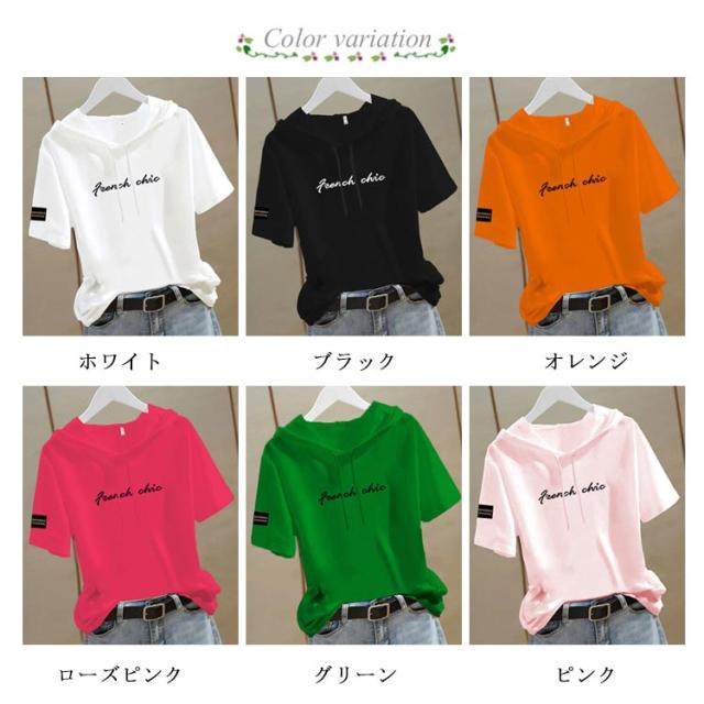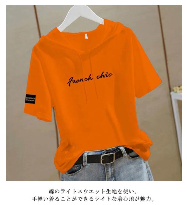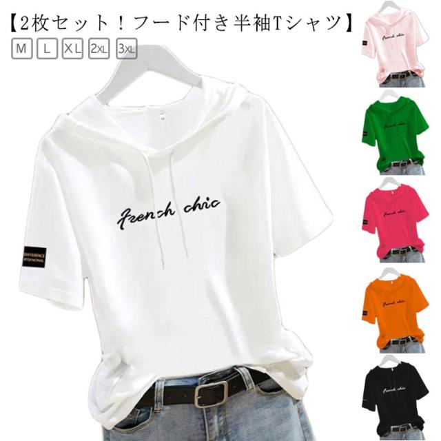 【2枚組】 フード付きtシャツ 半袖 レディース パーカーtシャツ フード付き tシャツ 薄手 夏 プルオーバー トップス 春夏 フーディー Tシャツ 送料無料 プリント ワンポイント フード カットソー テーシャツ シンプル カジュアル きれいめ キレイ目