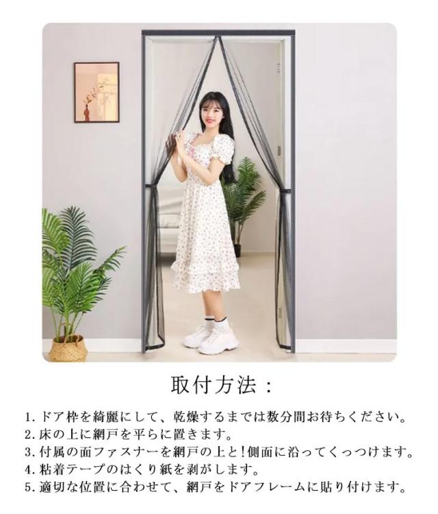 | 全20サイズ!マグネットタイプで自然に閉じる網戸カーテン 玄関や勝手口などに取り付けて虫除けや風通しに便利なアイテム! 強力な磁石により、素早く自動で閉まるので、荷物で両手がふさがっている時でも便利なマグネットカーテンです。大人と幼児ちゃん、ワンちゃん、猫ちゃんもスムーズに通過できます。 極細タイプの網の方が虫が取りぬけられません。米より小さい綱目、しっかり虫をブロックしてくれます。 虫を防ぎながら新鮮な空気が入ることを可能です。外の風景が見やすいように空間率を大きくしています。空気の流通にも邪魔しません。 まわり全てマジックテープ式です、カーテンが丈夫に固定されます。貼り付け式タイプなので取付も簡単! 使わない季節には取り外し、洗浄して折りたたんでコンパクトに収納できます。 ご購入の前に設置予定箇所のサイズを確認し、本製品が適合するかをお確かめください。 取付方法:1.ドア枠を綺麗にして、乾燥するまでは数分間お待ちください。 2.床の上に網戸を平らに置きます。 3.付属の面ファスナーを網戸の上と!側面に沿ってくっつけます。 4.粘着テープのはくり紙を剥がします。 5.適切な位置に合わせて、網戸をドアフレームに貼り付けます。 | |