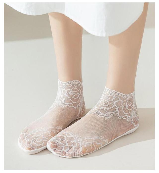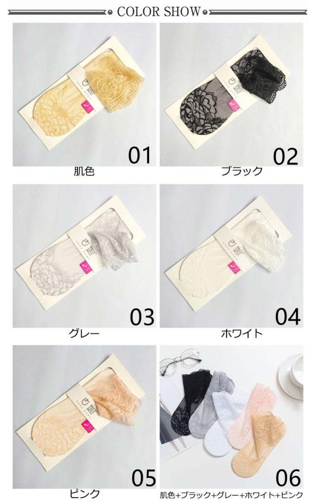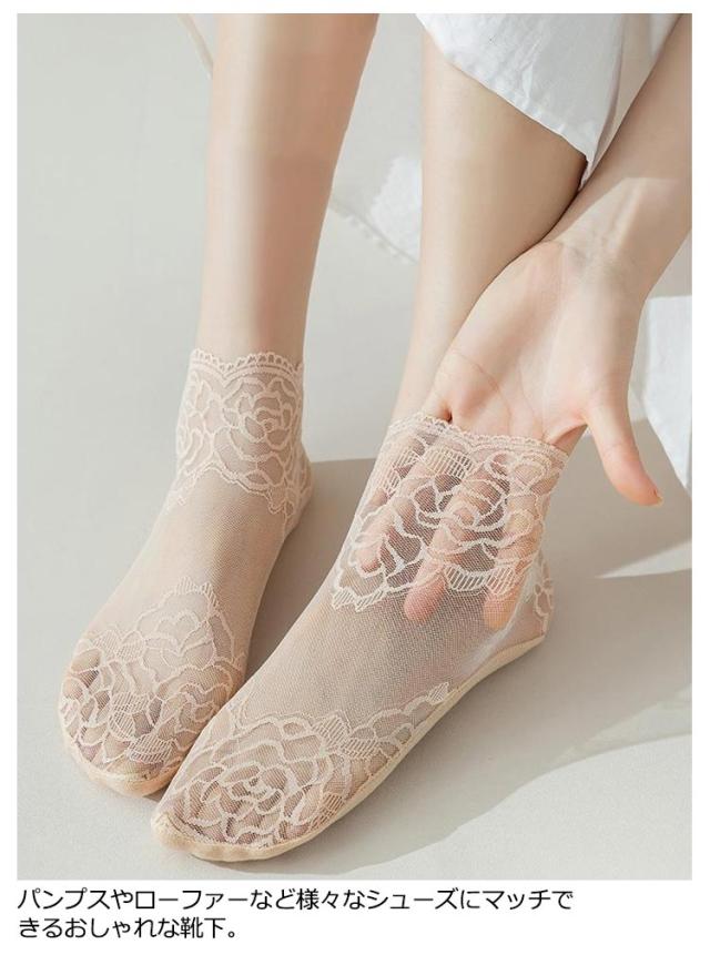 | 【5足セット】 【花柄シースルレースで透け感が楽しめるおしゃれ】 フェミニンな足元を演出してくれるレースソックス。 パンプスやローファーなど様々なシューズにマッチできるおしゃれな靴下。 伸縮性のあるレースで程よくフィットし、脱げない。 底面は綿素材で、通気性よく、滑りにくいから履き心地がGOOD! | |