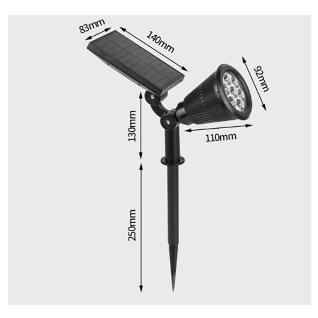 | サイズについての説明 | サイズ:ソーラーパネル:DC5.5W/15W 高効率多結晶パネル バッテリー:リチウム電池DC3.7V/1200mAh 太陽光充電時間:4-6H(日照強度や季節によって誤差) 発光時間:8-10H (日照強度や季節によって誤差) IP65防水 |