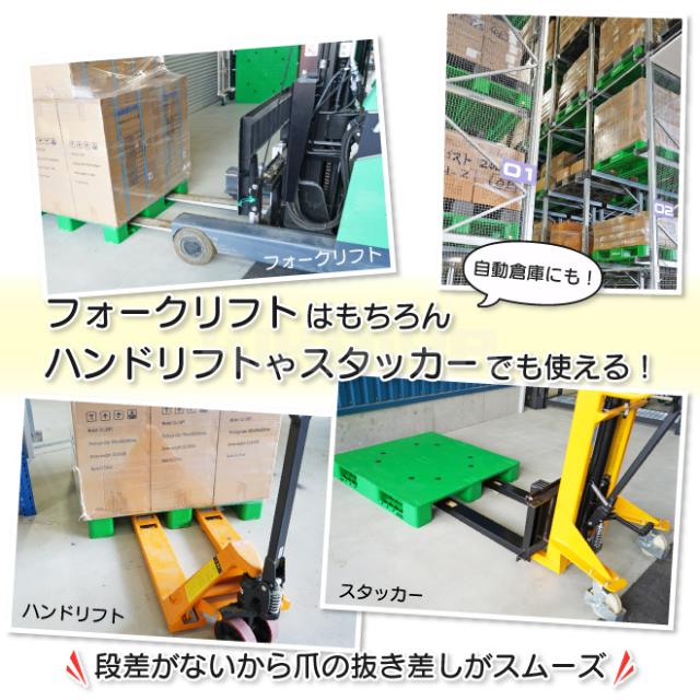 再生素材不使用・角パイプ内蔵で頑丈! ハンドリフトやスタッカーも使用可能なゲタ型・片面四方差し! ●強度や耐衝撃性に優れ、剛性が高い ●ハンドリフトやスタッカーも使用可能なゲタ型・片面四方差し ●パレット内部に角パイプが組み込んであり、再生素材を使用していないため、 頑丈で割れたり変形しにくい ●原材を使用しておりますので、綺麗な発色の緑色です ●自動倉庫にも使用可能! ●載せた物が滑りにくいよう、上面に滑り止めゴムが20ヶ所も付いています ●互い違いに重ねられてコンパクトに収納できます ※屋外や湿気の多い場所では使用しないでください ☆お得な5枚セットでの販売も行っております 【関連商品】 ・運搬に便利な【パレット台車】はこちら |