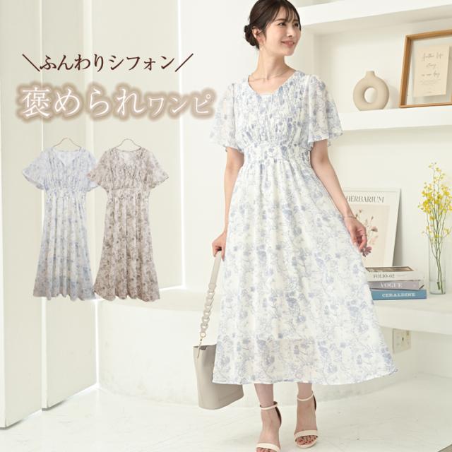 ロングワンピース 半袖 レディース 花柄 vネック ワンピース きれいめワンピース vネックワンピース 夏 ロング フレア袖 ボリューム袖 ウエストシャーリング ウエストギャザー 上品 清楚 夏ワンピース 切り替え 花柄ワンピース 半袖ワンピース フレアワンピース 白