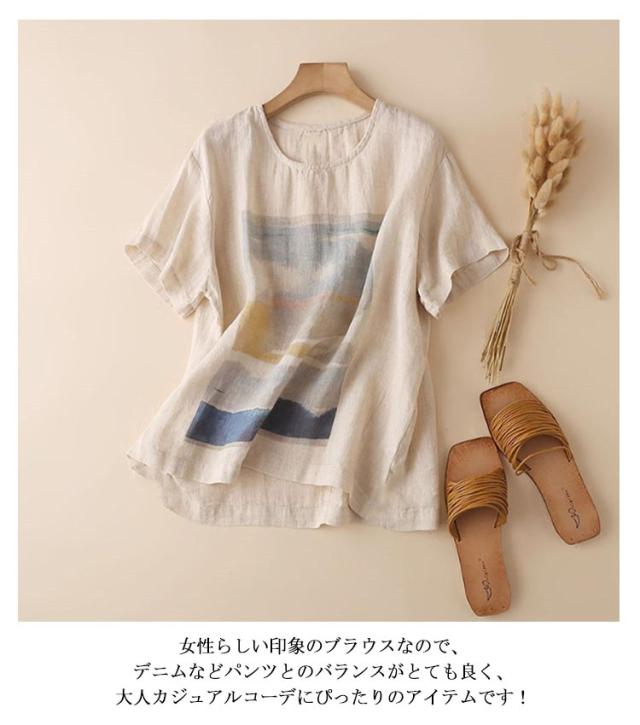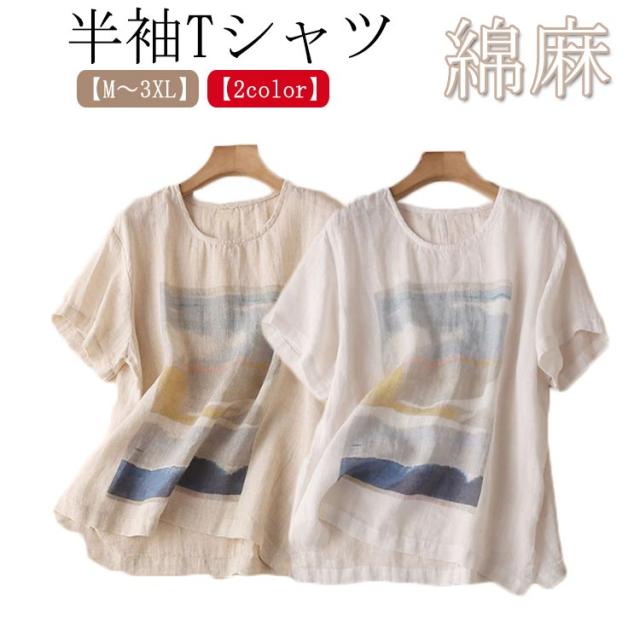 半袖 カットソー レディース 綿 麻 ゆったり Tシャツ ブラウス 半袖 Tシャツ シャツ リネン 夏 ナチュラル 薄手 トップス コットンリネン 綿麻 プルオーバー M L XL 2XL 3XL 体型カバー 大人 シンプル カジュアル 大きいサイズ 春 秋 可愛い おしゃれ 送料無料