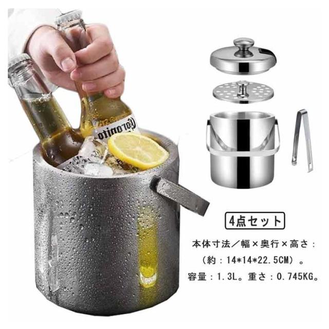 4点セット アイスペール 二重構造 真空断熱 1.3L アイスバケツ 業務用アイスペール 全ステンレス構造 ステンレスブラック アイスバケット 氷入れ 蓋 アイストング付き 保冷容器 お酒 ビール ワイン シャンパン 業務用