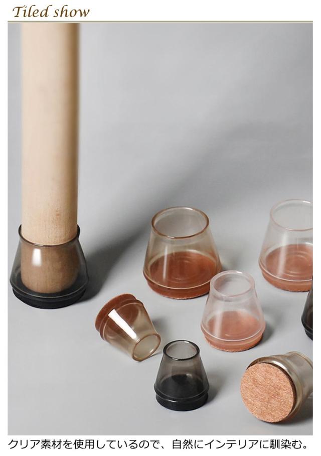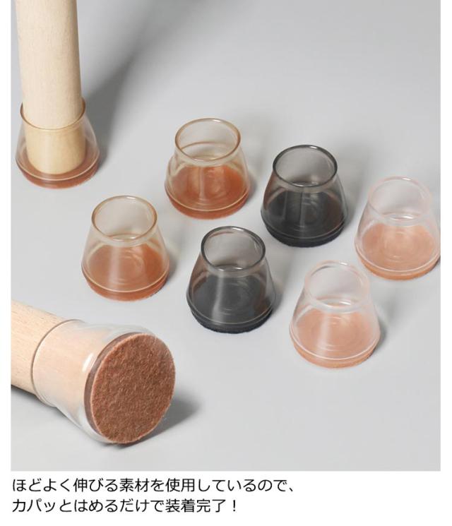 | クリア仕様でおしゃれに椅子の脚をカバー!カパッとはめるだけの簡単装着。 3色展開でインテリアに合わせてお選びいただけます。 水洗い出来るので、清潔に繰り返してご使用いただけます。 底部のフェルトがシリコン素材と一体のため、フェルトが取れるのを防ぎます。 椅子脚とフローリングが擦れる嫌な音もなくなり、小さいお子様がいるご家庭、お掃除などの際に役立ちます。 椅子4脚分がセットになった嬉しい16個入り!お引越しや模様替えのタイミングで揃えるのもGOOD。 | |